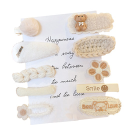 Autunno inverno graziose forcine per capelli per bambine di colore neutro soffice orsacchiotto lavorato a maglia con fiocco di fiori in tessuto